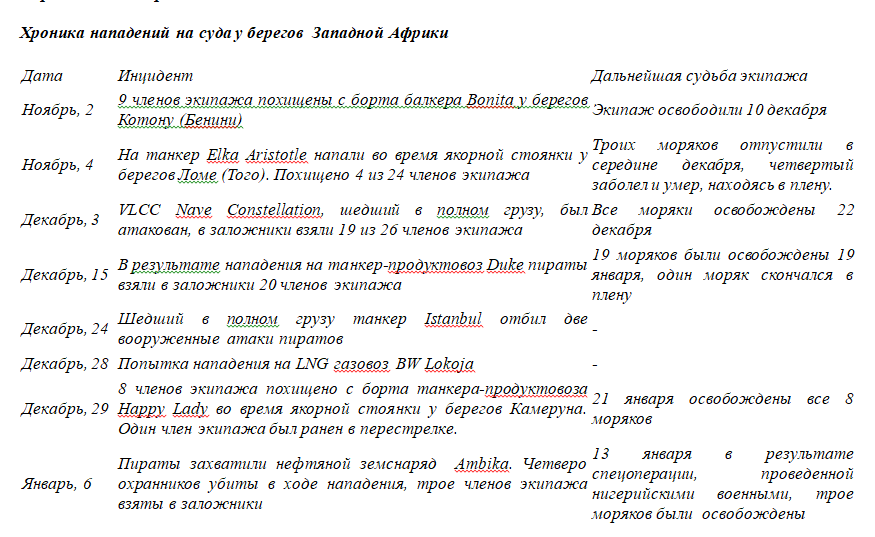 – Неэффективная деятельность органов власти и процветающая в регионе коррупция, отсутствие на многих судах вооруженной охраны не способствуют успешной борьбе с пиратством в регионе. Дельта Нигера остается «горячей пиратской точкой» в течение многих лет, – отмечают в Российском профессиональном союзе моряков. – Однако если раньше в приоритете пиратов были угоны судов и похищения грузов, то сейчас – заложники с целью получения выкупа. Сейчас многое зависит от того, как с этим вызовом справится нигерийский ВМФ, учитывая, что пираты теперь ведут себя агрессивнее, нападения происходят с применением насилия, в плену моряков содержат в крайне плохих условиях. В декабре два моряка скончались от болезни, находясь в плену у пиратов.
