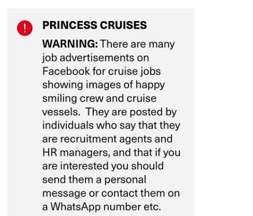 На просторах интернета заманчивых предложений о трудоустройстве на шикарные круизные лайнеры – пруд пруди. Они сопровождаются красивыми фото, с которых смотрят счастливые и довольные члены экипажа, работающие на великолепных судах. Сообщения от Princess Cruises не стали исключением. Только если сама компания действительно существует, то появившаяся в Facebook информация о наличии вакантных мест – не что иное, как фейк.